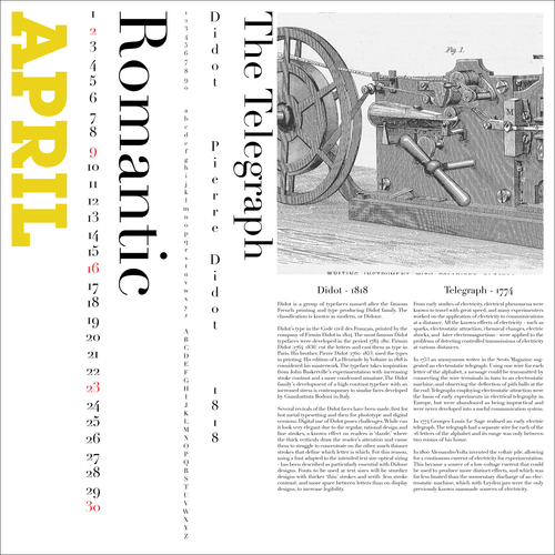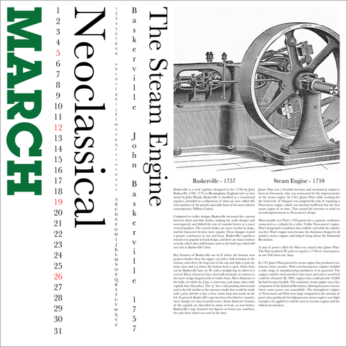 This project’s goal was to create a calendar using the 24x24 folder format similar to European-style calendars. The calendar presents typefaces used from the first printing press to modern times. Each typeface is associated with a piece of technology from the same era.